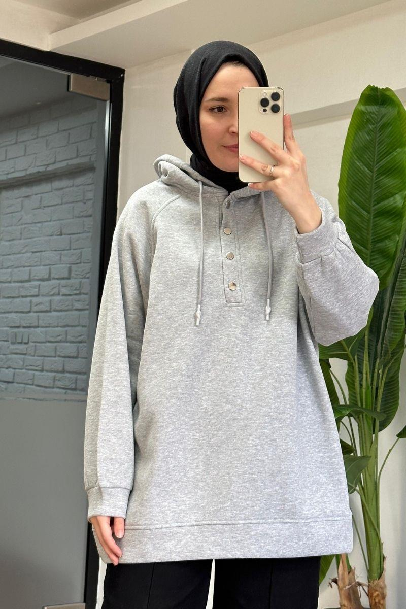 Çıtçıtlı Kapşonlu Sweat  Gri