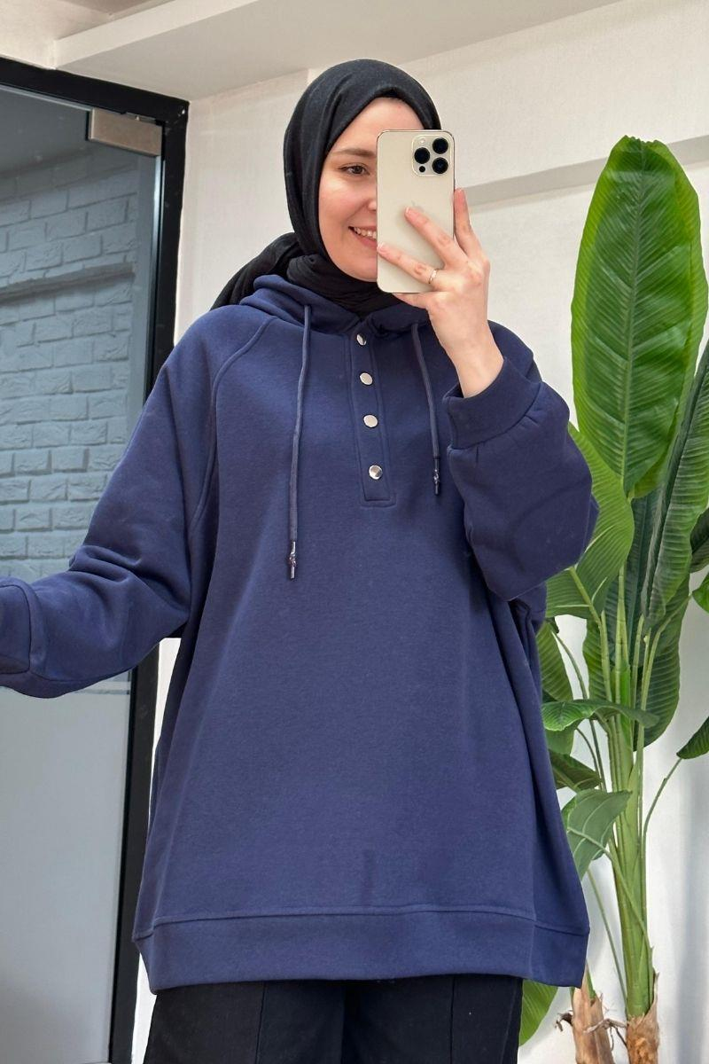 Çıtçıtlı Kapşonlu Sweat Lacivert