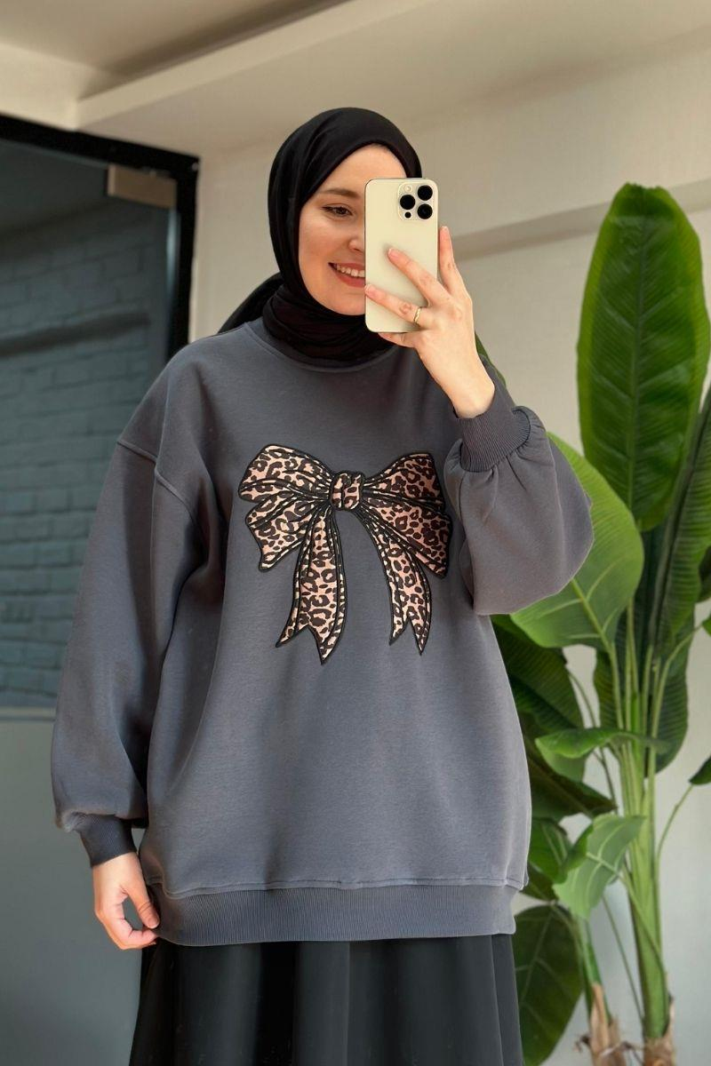 Leopar Fiyonk Nakışlı Sweat Füme (ML01878-6823)