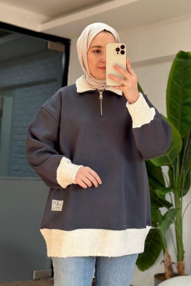 Peluşlu Fermuar Detaylı Sweat Füme (ML01896-6880)