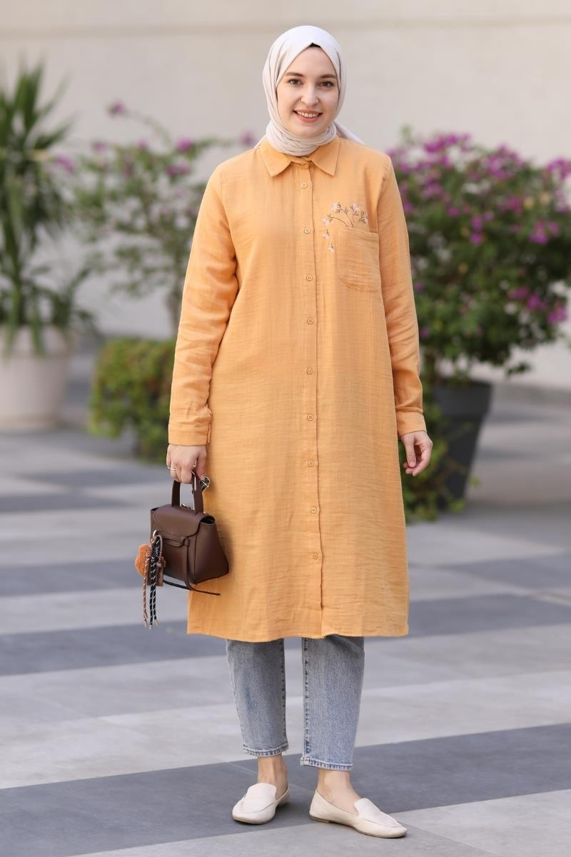 Rosa Nakışlı Müslin Uzun Tunik Hardal